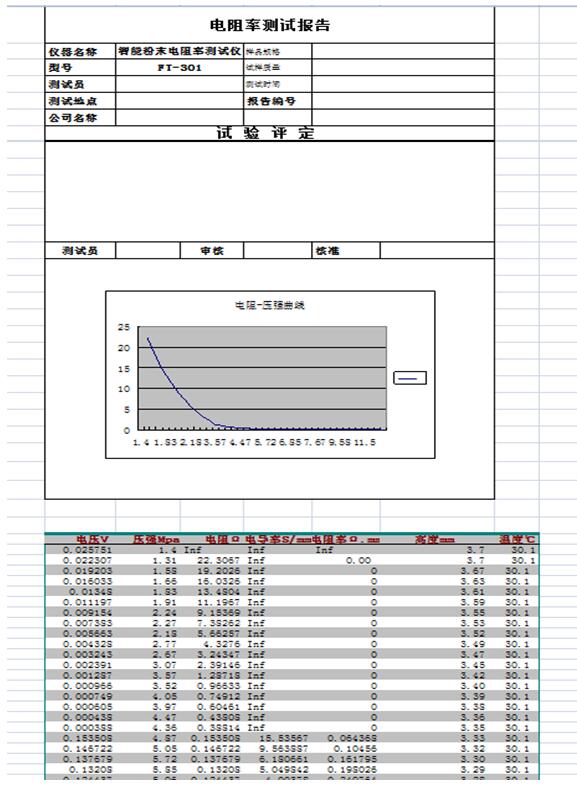 電阻值、電阻率、電導(dǎo)率值、溫度、壓強值、單位自動換算、 橫截面積、厚度、曲線圖譜、壓實密度、生成報表等. |