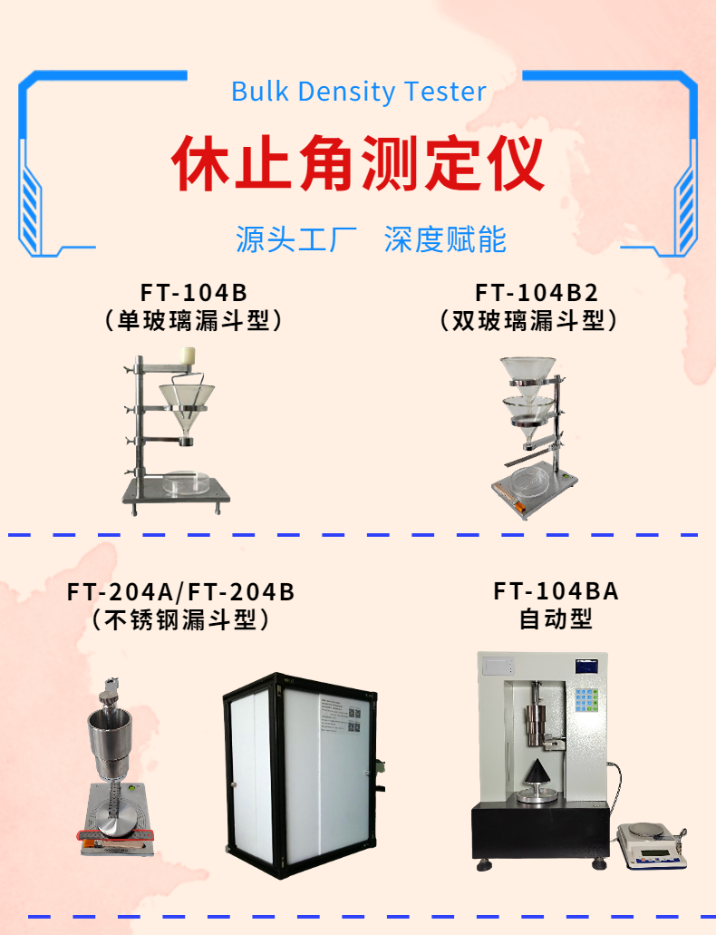測(cè)試粉末和顆粒通過(guò)漏斗的時(shí)間和形成的角度,測(cè)試前進(jìn)行預(yù)堆積,從而已知樣品量,將已知質(zhì)量粉末從漏斗流出而形成的堆積角,以及流出所需要的時(shí)間;可以獲得休止角和流速數(shù)據(jù)。